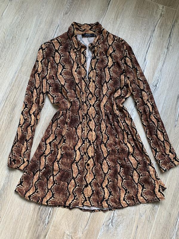 Платье из натуральной ткани известного бренда Bershka в змеином принте, размер s, также красиво сядет на m, спереди застегивается на пуговицы, можно дополнительно подчеркнуть поясом талию.