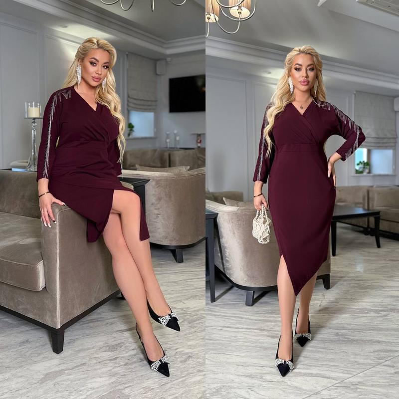 Неймовірно красива коктейльна Сукня 💫💫💫 яка закохує с першого погляду 🥰 Модель #1407 Ціна 1250 грн Розміри 👉48-50,52-54,56-58,60-62 В тканині мікродайвинг дуже гарної якості👍 Кольори чорний, ізумруд, Бордо Йде вверх запах на грудях Гарно підкреслює форми та йде у великих розмірах Оздоблена гарною бахромою Тканина тягнеться до 8 см‼️ Гарно сідає на любий тип фігури👌 Заміри👉 48-50 Ог 96-110; От 86-95 ; Об 104-112 см , довжина 110 см 52-54 Ог 104-116 ;от 96-104 ;Об 112-120, довжина 113 см 54-58 0г 114-123 ; От 104-120 об 122-130, довжина 114см 60-62 Ог 124-133 см ,От 114-122 ,Об 132-140 довжина 115 см Довжина рукава 60 см Параметри моделі 🤗 100-74-100