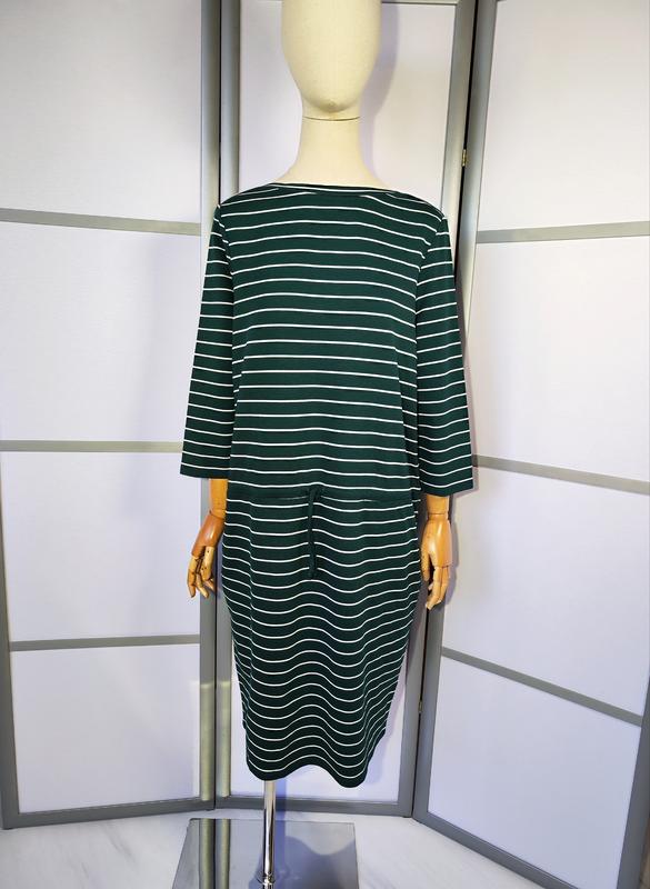 BONITA трикотажное темно-зеленое платье в полоску 68% вискоза, 28% полиамид, 4% эластан, средней плотности, приятное к телу, гладкое Прямого силуэта, заниженная талия, шнурок, рукав 3/4 Идеальное состояние Размер XL длина от плеча - 108 от плеча до заниженной талии-55 полуобхват в груди-54 в стегнах-54 полуобхват внизу-54 плечо-8 рукав -49 ширина в плечах -43 Возвращение не предусмотрено