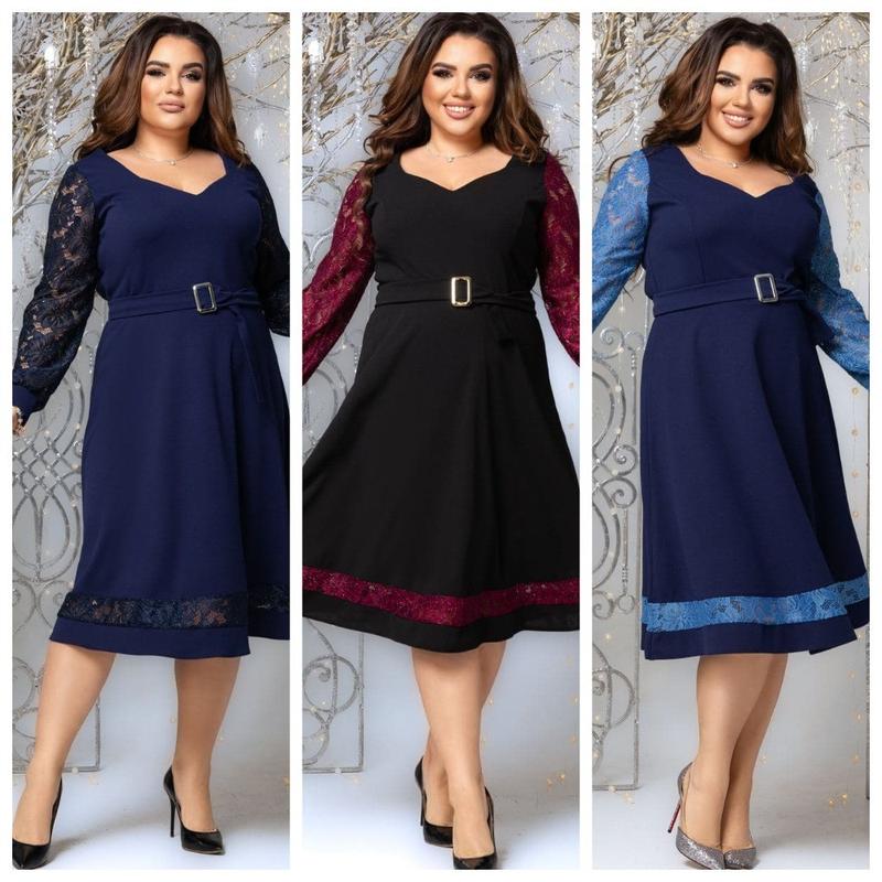 Платье из креп-дайвинга юбка клешь с рукавами из гипюра с пояском больших размеров