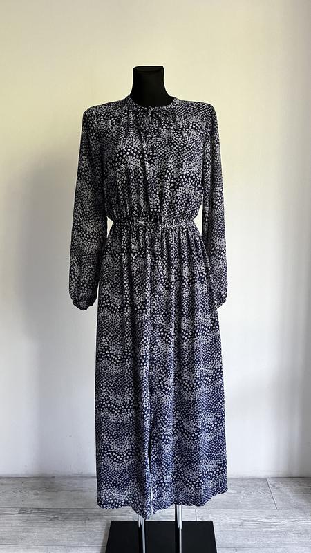 Синє шифонове плаття з принтом 100% поліестер Стан ідеальний Розмір С Півобхват грудей - 54 см Півобхват талії - 31 см+ резинка Півобхват стегон - 56 см Довжина рукава від горловини - 70 см Довжина - 127 см