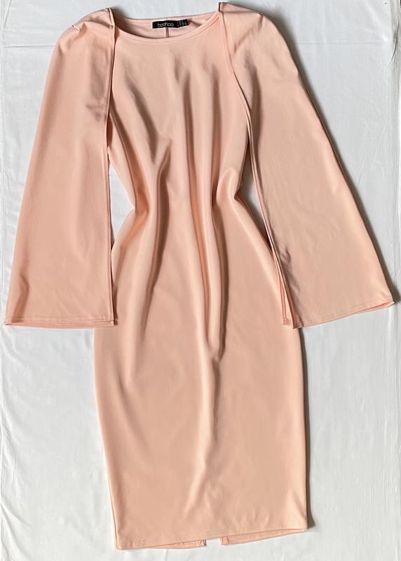 Приталена сукня, персикового кольору. Длина миди. Рукава - как накидка. Ткань очень красиво тянется Бренд: Boohoo Размер: UK10 ( S) Состав ткани: 100% полиэстр Параметры: Полу объем в груди 40-43 см Полу объема в талии 36-39 см Полу объем в бедрах 44-46 см Длина 102 см