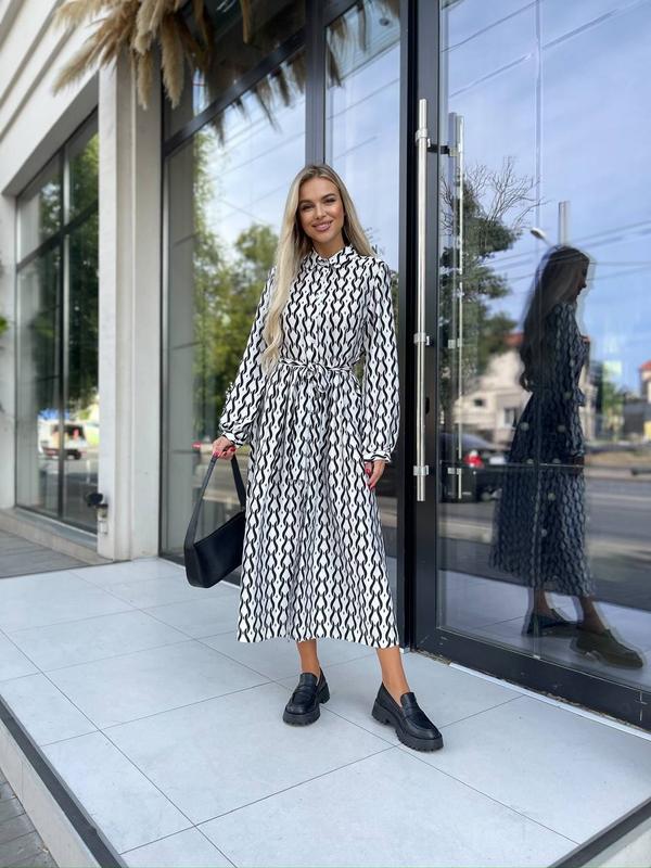 Платье-рубашка в геометрический принт. материал: шелк Турция цвет: белый, коричневый, черный размеры: S (42-44), L (46-48), XXL (50-52), 3XL (52-54) Ориентировочные замеры по готовому изделию: S (42-44) ОГ - 84-88 см, по виробу - 92-94 см. ОТ - 62-66 см, по виробу - 80 см. ОБ - 90-94 см, по виробу - 140-148 см. Длина - 125-127 см. Длина рукава по внутреннему шву - 47 см. L (46-48) ОГ - 92-96 см, по виробу - 100-102 см. ОТ - 70-74 см, по виробу - 88 см. ОБ - 98-102 см, по виробу - 148-156 см. Длина - 127-129 см. Длина рукава по внутреннему шву - 47 см. XXL (50-52) ОГ - 100-104 см, по виробу - 108-110 см. ОТ - 78-82 см, по виробу - 96 см. ОБ - 106-110 см, по виробу - 156-164 см. Длина - 129-131 см. Длина рукава по внутреннему шву - 47 см. 3XL (52-54) ОГ - 104-108 см, по виробу - 112-114 см. ОТ - 82-86 см, по виробу - 100-102 см. ОБ - 110-114 см, по виробу - 164-172 см. Длина - 130-132 см. Длина рукава по внутреннему шву - 47 см.