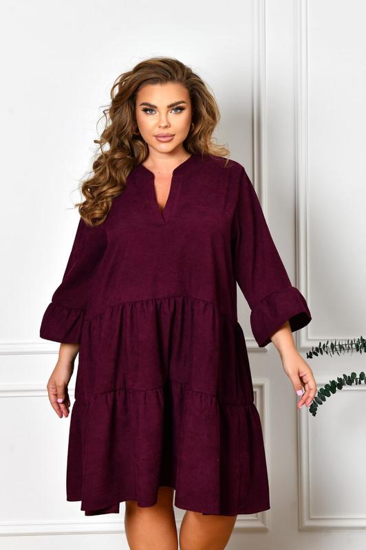 Сукня НОВИНКА💥💥💥 Цена 950 грн. Тканина: мікровельвет (не мнеться). Цвета: фрез, черный, марсала. Размеры: 48-50, 52-54, 56-58, 60-62, 64-66. Длина платья: 100, 101, 102, 103, 104 см. Длина рукава: 46, 47, 47, 48, 48 см. Обхват рукава: 42, 44, 46, 48, 50 см. Замеры готового изделия: 48-50 ОГ 117 ОТ 125 ОБ 190 52-54 ОГ 126 ОТ 134 ОБ 200 56-58 ОГ 134 ОТ 142 ОБ 208 60-62 ОГ 142 ОТ 150 ОБ 216 64-66 ОГ 150 ОТ 158 ОБ 224 На модели размер 52-54❗️❗️❗️ Рост 170 см. ОГ 108 ОТ 85 ОБ 115 см✅ Невероятно стильное платье свободного силуэта из микровельвета (ткань не тянется). Платье состоит из лифа и юбки в два яруса. Вырез горловины V-образный, визуально удлиняющий шею, оформлен небольшой стойкой. Рукав декорирован воланом, его длина 3/4. Застежек и карманов у платья нет філат