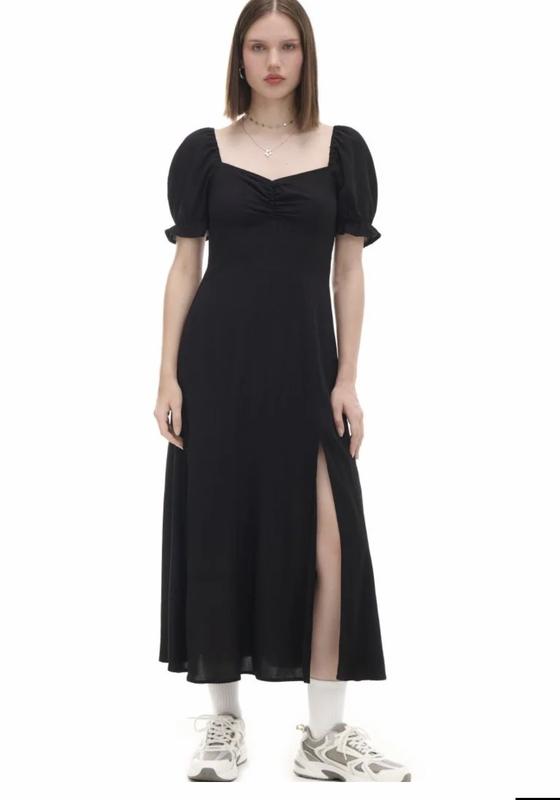 100% віскоза довжина міді бічний розріз декоративні складки спереду короткі об’ємні рукави з зібраними гумкою манжетами