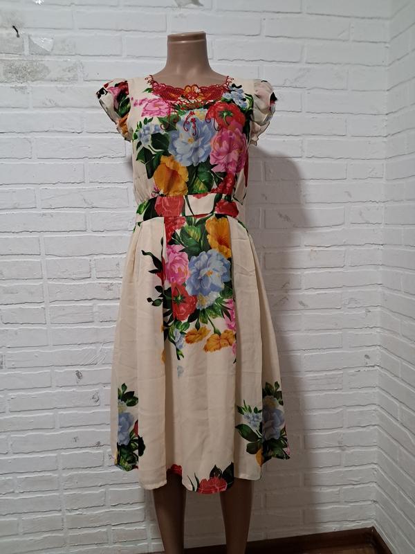 стан ідеальний, без деффектів та нюансів тканина середньої щільності, не тягнеться напівобхват груди 43 напівобхват талії 36 напівобхват бедер вільно до 80 плечи 34 рукав рюша 8см довжина 97 довжина спідниці без пояса 58см