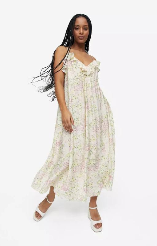 Платье длиной до икры, без рукавов из вискозной смеси с V-образным вырезом, обработанным оборкой, и узкими регулируемыми бретелями. Собранный шов под грудью и узкая прикрытая резинка на спине. Без подкладки. Состав: 81% вискоза, 19% полиамид. Размер xs, можно и на мелкий s ПОГ - 34/47см (еластична резинка позаду) ПОТ - свободно 60 см ПОБ - свободно 80 см Длина +-120 см (в среднем положении бретелей)