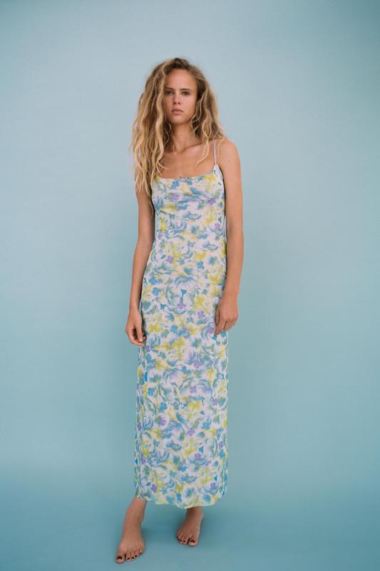 Сукня середньої довжини з круглим коміром і тонкими регульованими бретелями. Деталі з мережива та зав'язки. Контрастна підкладка.