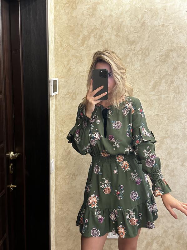 Красивое платье цвета хаки с цветочным принтом, на рукавах и юбке воланы, есть подкладка. Размер указан 36, регулируется так же, как на поясе резинка.