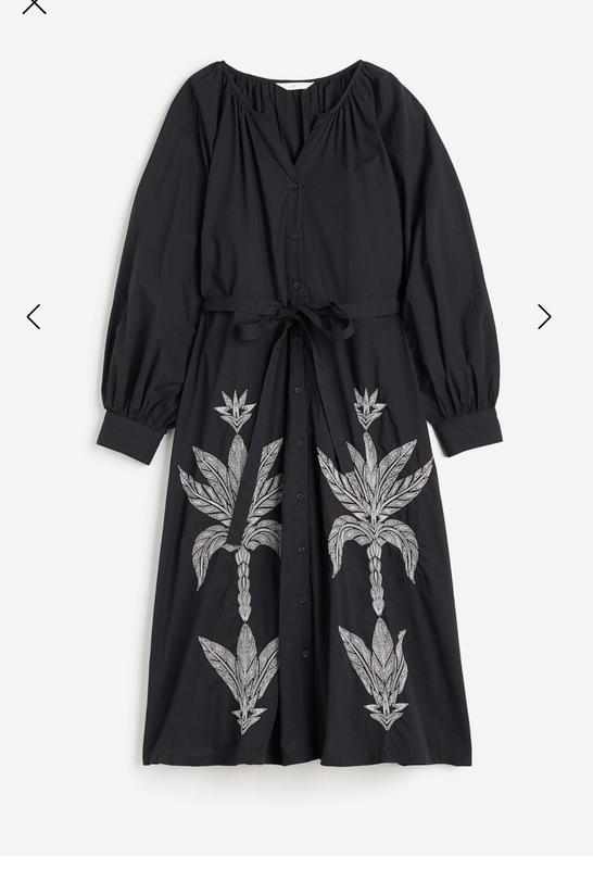 Черное платье с узором цена 50 евро Пог-55 Пот-52 Длина -119 Рукав от с манжетом-73 Платье длиной до теленка из хлопкового переплетения с круглым вырезом, небольшим V-образным отверстием сверху и пуговицами спереди. Длинные, объемные рукава с воздушным шаром регланового кроя с манжетами на пуговицах. Съемный пояс для галстука на талии и слегка расклешенная юбка с контрастной цветной вышивкой. Без подгода. Материалы: 100% хлопок Цвет: Черный редиден: Повседневный Посадка: Обычная посадка Длина одежды: Midi Линия шеи: Круглая горловина, V-образный вырез Рукав: Рукав на воздушном шаре, рукав реглан, длинный рукав