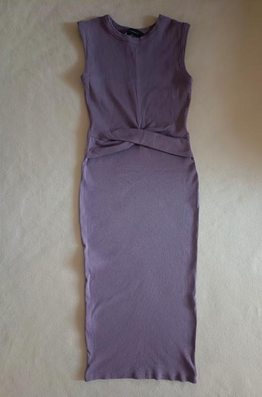 платье -миди в мелкий рубчик, сиреневого цвета(в реальности цвет светлее чем на фото), на размер S (XS, возможно на небольшую M), ткань хорошо тянется, эластичная. Общая длина по спине 103см, полуобхват груди 34см =в спокойном состоянии.