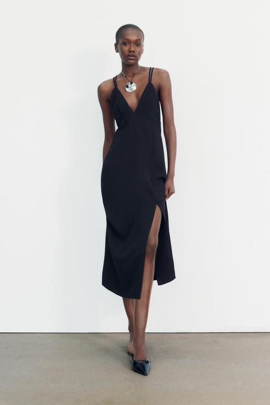 Платье с V-образным вырезом и тонкими двойными бретелями. Разрез спереди снизу. ЧЕРНЫЙ | 2157/024