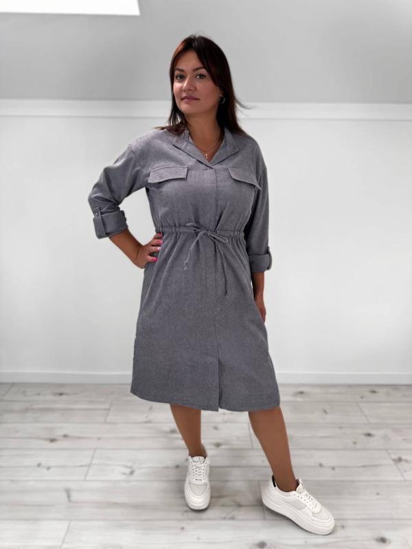 Плаття арт. ha2. 2772 Тканина: вельвет Колір: сірий, бордо, темно-синій, смарагдовий Розміри: 48-50, 52-54, 56-58 Сукня з довгим рукавом на манжетах із гудзиком. Рукав також можна застебнути на патик. З куліскою під грудьми. Комірець стійка. Спереду розріз.