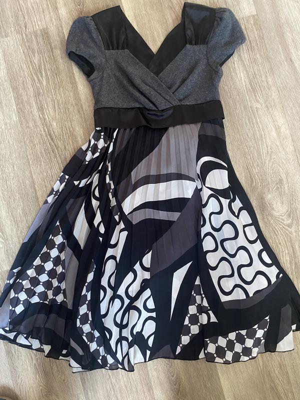 Италия.Цикавое сочетание тканей.Верх-трикотаж,мягенький и приятный,гарно ложится по груди, размер на чашку А-В.Размер 40,XS.Ткань рукава и юбки-атлас, или сатин. Юбка плиссе.Позада на талии завязывается прядкой.В очень красивом состоянии, милые нюансы, причепки, но ничего серьезного, нет пятен,ни дырок.Едине, что я бы посоветовала подъюпник,бо светится. Мы покупали без него. Задавайте вопросы!бойтесь за просмотр)
