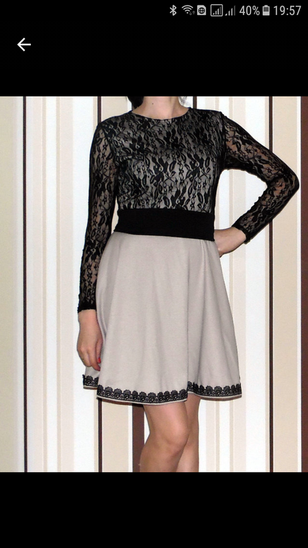 модне плаття,розмір Л,42.Тканина ,французький трикотаж,до пояса по верху тканини іде гіпюр,рукава-гіпюр,(прозорі),низ обшитий мережкою.Ширина у плечах 39см,ширина грудей 43см,ширина талії 38см.Довжина рукава 58-59см,довжина від плеча до низу 90см,довжина від плеча до талії 42см.До плаття іде пояс із тканини шириною 8см,довжиною 145см.Трохи тягнеться.До пояса облягає,низ розширений.Нове з біркою,не підійшов розмір.