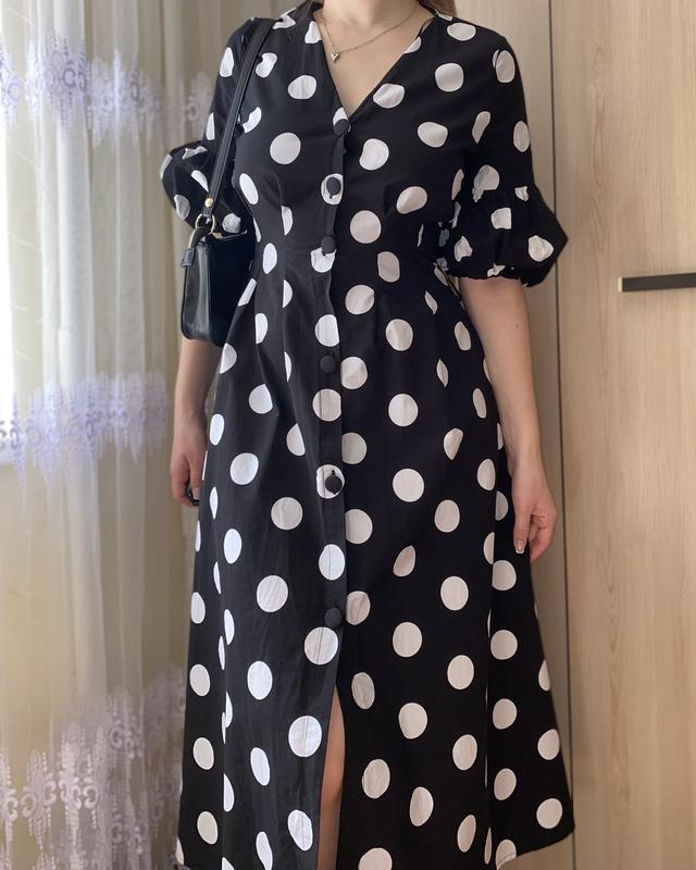 Нова чорна бавовняна сукня міді у великий білий горох zara, довга сукня з рукавами фанарик...