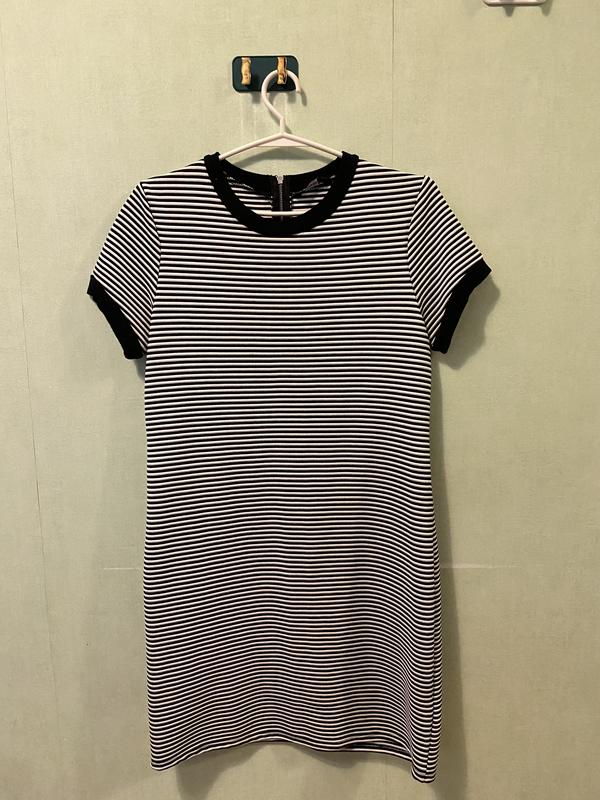 Сукня George Розмір: EUR 40/L Стан: нова, одягалась 1 раз на 10 хвилин. Сукня тягнеться та сідає по фігурі. Сукня в полоску чорно-білу. Підійде на розмір EUR38 і до невеликого EUR42. Зручна та приємна до тіла. Плям та дефектів немає. Довжина вище коліна при зрості 167 см.