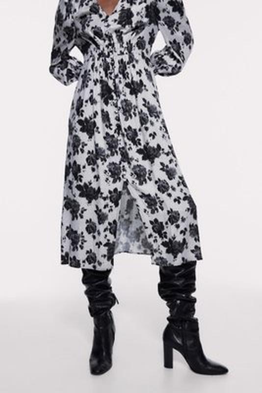 Платье миди Zara в цветочный принт на сером фоне. Манжеты рукавов и центральная поясная часть переда и спины выполнена резинкой. Плечи объемные за счет прострочки дополнительной ткани по плечевому шву (показано на фото). Застегивается на пуговицы, обтянутые тканью. Размер указан S. Длина - 116 см, Плечи - 34 см, Пог - 40 см, Пот - 34 см, Рукав - 60 см. 100% вискоза. Тканина легка. Имеется нюанс - на 1 пуговице в районе талии ткань разошлась ( последнее фото).
