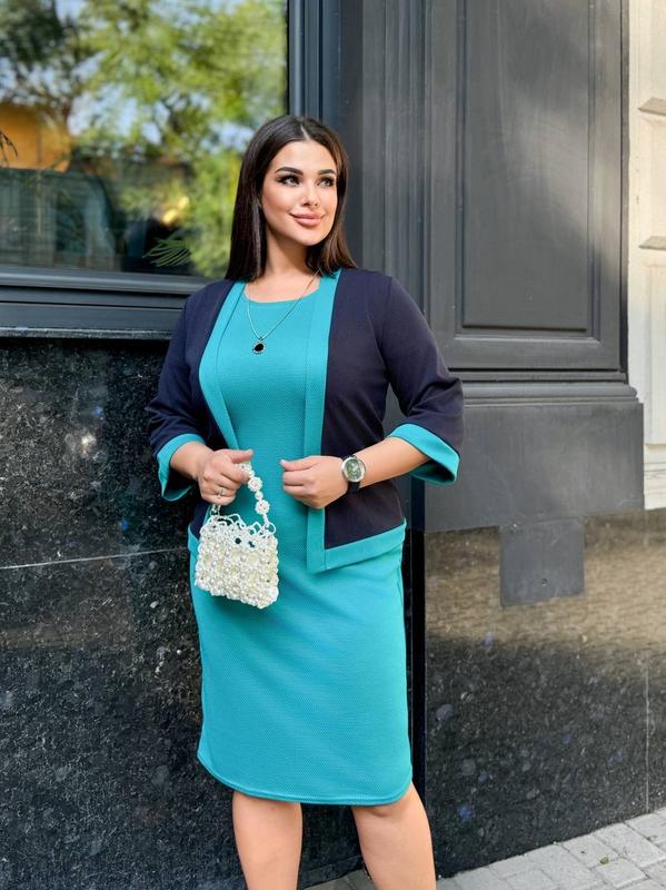 Комплект (сукня + жакет + кулон) арт. glad. с 41873 Размер: 50-52, 54-56 Ткань: структурный трикотаж (эластичная, мягкая, приятная) Платье облегает фигуру, подчеркивая ее силуэт и выглядит очень элегантно, а жакет добавляет образу завершенности и шарма