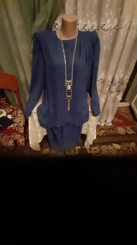 нарядна сукня синього кольору с підкладкою,матеріал полієстер б/у,,,дліна сукня 1,13см,об груді 100см,об талії 76см,рукав дліний 56см,у гарному стані,розмір 46-48.