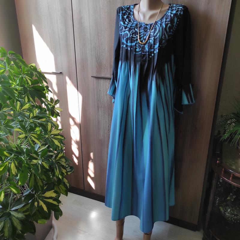 Новое платье, идеальный пошив, интересный фасон- делает фигуру стройнее, интересная фактура ткани, эффектный принт ( сочетание черного и бирюзового), облик стильный; ПОГ- 50 длина-125 рукав-47