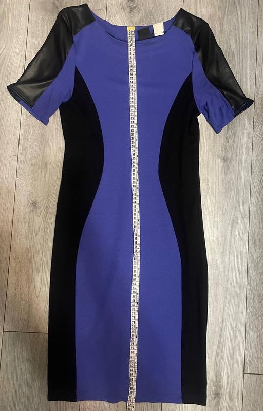 Сукня синього кольору з чорними вставками. На спині блискавка. Тканина трішки тянеться. Заміри на фото, При необхідності скину додатково фото чи заміри. Сезон: осінь,весна,зима.