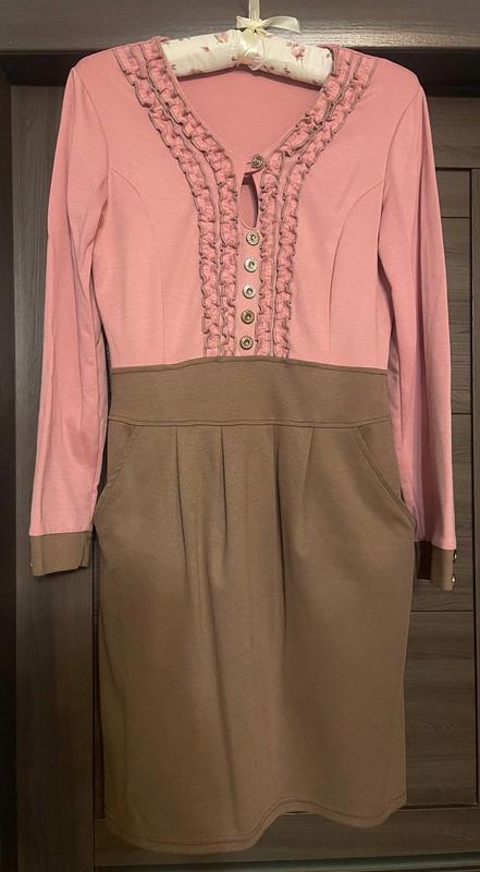 Сукня з рожевим верхом і коричневим низом з карманами. Можна одягати з поясом, можна без. Сезон: осінь,весна,зима. Заміри на фото. При необхідності додатково надам фото чи заміри.