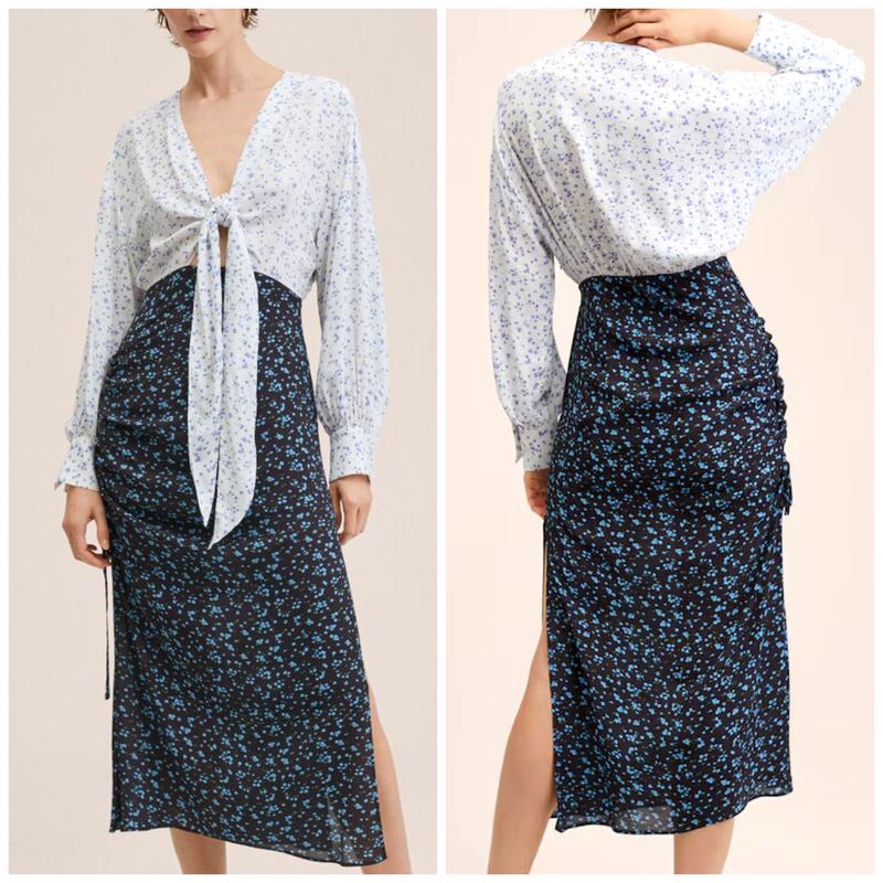 Мango Іспанія Квітковий візерунок. Комбінована модель. V-подібний виріз.Довгі рукава з гудзиками на манжетах. Передній розріз, збірка. Бічна застібка-блискавка. Підклад - шифонова міні спідниця В наявності декілька розмірів S,L 100% ВІСКОЗА. ПІДкладка: 100% ПОЛІЕСТЕР В Україні ціна цієї моделі була значно дорожче