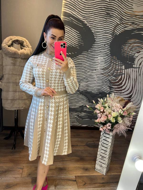 Осветляющая КРАССИВАЯ СУКНЯЯ ПРИТАЛЕНОГО СИЛУЕТУ ВИКОНАНА С КАЧЕСТВЕННОГО ТРИКОТАЖА МАШИННОЙ ВЯЗКИ ИЗ ЭФФЕКТНЫМ ПРИНТОМ, УКРАШЕННАЯ УШИТЬ В СОЛОТИСТИМЫ ГУДЗЫКИ ДОВЖЕННАЯ РУКАВА ОТ ШИИ 75 СМ ДОВЖИНА ВИРОБУ 100 СМ РАЗМЕР ЕДИНЫЙ 46-48 КОД 0410
