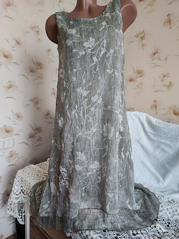 Лёгкое брендовое двухслойное платье выполнено из тонкой, полупрозрачной ткани. Верхний слой платья украшен изящным цветочным узором, который изображает ветви с цветами и листьями, тонко переплетающимися по всей поверхности. Преобладают светлые оттенки, что создаёт контраст с более тёмным фоном ткани, придавая платью воздушность и романтичность. Ткань платья выглядит струящейся, полупрозрачной, что добавляет ему лёгкости и элегантности. Платье прямого кроя, слегка расширяющееся книзу, что делает его свободным и удобным для носки. Простой крой без рукавов подчёркивает нежность и непринуждённость стиля, а округлый вырез горловины гармонично дополняет общую композицию. Два слоя ткани создают интересный эффект наложения, придавая платью объём и глубину. Нижний слой выполнен из ткани, схожей по цвету, что создаёт цельный образ, сохраняя при этом лёгкость и воздушность. Платье идеально подходит для тёплой погоды, создавая ощущение комфорта и лёгкости при движении. Верхний слой от плеча 94 см., нижний спереди 105 см., бока удлиненные 115 см. ПОГ-ПОТ-ПОБ 48-50-60 см. Состояние идеальное. Дефектов нет.