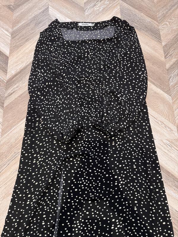 Стильна сукня міді в горох з розпіркою на ніжці. Стан гарний, але є нюанс, брак тканини, так і купувала. Останнє фото. При носці не помітний. Розмір л-хл. Груди 50 Довжина рукава 65 Талія 49 Стегна 55 Довжина 110