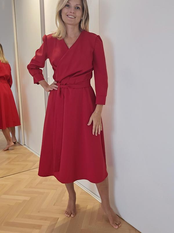 Яркое красное платье, в длине миди, которое имитирует эффект на затин. Отлично корректирует фигуру, скрывая недостатки и подчеркивая достоинства. Надевается не как халат, сшитое по талии на резинке, что очень удобно и можно не беспокоиться, что платье решится в какой-нибудь ответственный момент) поверх резинка завязывается пояс, из такой же ткани как само платье. Под запрос сделает дополнительные фото и съемку мерки.