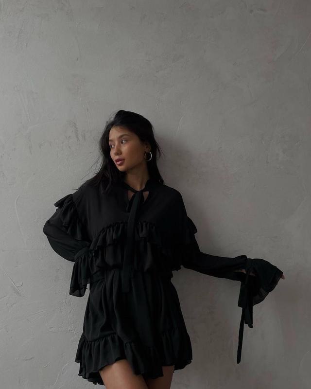 Платье женское, мини, черная, свободного кроя, с рюшами