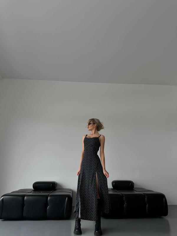 Женское платье, миди, черное, цветочный принт, с разрезами на ногах, на бретелях