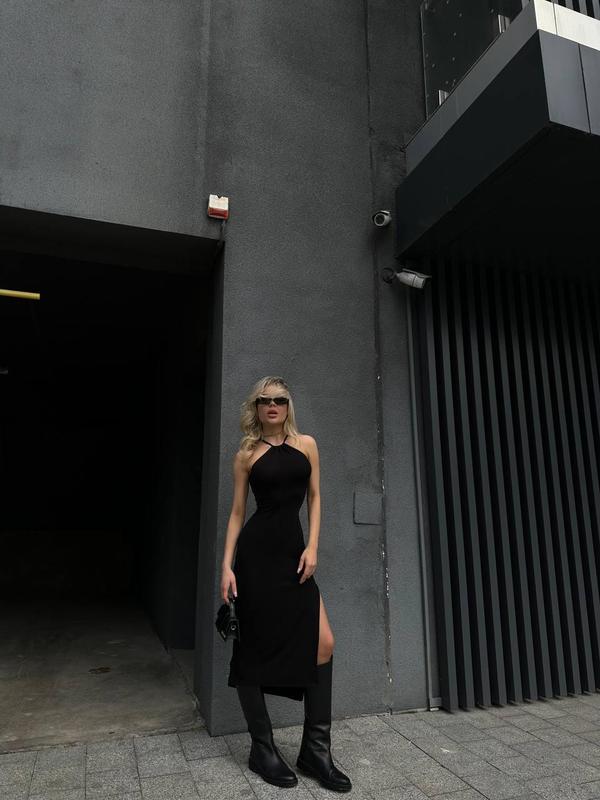 Платье женское, миди, черное, на бретелях на шею, с разрезом на ноге, открытая спина