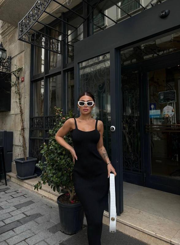Платье женское, миди, черное, приталенная, рубчик, на шлейках