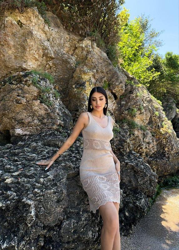 Платье женское мини бежевое на бретелях с ажурными вставками