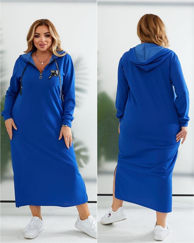 Платье поло спортивного стиля с капюшоном Ткань: креп дайвинг Размеры: 50-52, 54-56, 58-60, 62-64 Цвета: черный, красный, электрик, бутилка #140 Платье свободного кроя с длинным рукавом. Декольте на молнии. На груди нашивка. Внизу по бокам разрезы. Есть два кармана. Ткань легкая, очень хорошо тянется. Капюшон с декоративной лентой. Лента может отличаться Цена: 735 грн