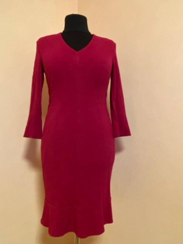 Классное платье из эластичной ткани: 69% вискозы, 6% эластана и полиамида, подкладка тонкая полиэстеровая и тоже тянется. Размер 4 указано. Цвет малиновый, демонстрировано на манекене 52 размера. Со три раза приключилась. Длина - 100см, плечи - 41см, рукав от плеча - 51см, пог - 46см, тянется до 54см, пот - 40см,до 49см тянется, поб - 53см, до 60см тянется.