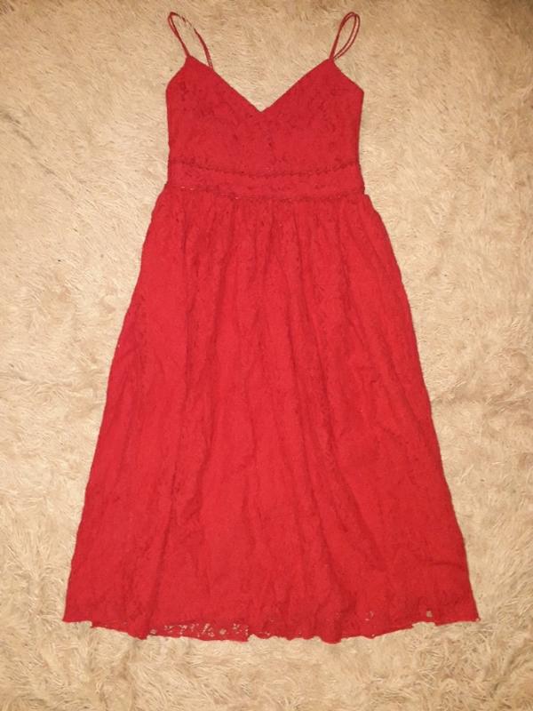 червоне мереживне плаття, напів оголені спина, виріз на грудях, на змійці, подовжене (до коліна)