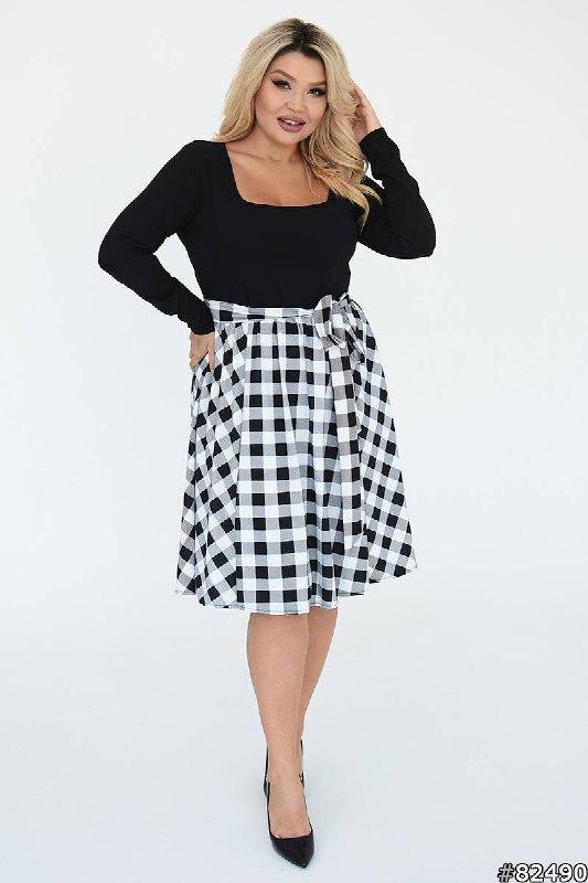 Сукня Тканина: верх- креп дайвінг, спідниця- французький трикотаж. Кольори: чорний, червоний. Розміри: 48/50, 52/54, 56/58, 60/62 Виміри: (48-50) ОГ 90, ОТ 80, рукав-63, від горла-72, довжина 100. (52-54) ОГ 98, ОТ 86, рукав 63, від горла - 63, довжина 102. (56-58) ОГ 108, ОТ 96, рукав- 63, від горла-72,довжина 104. (60-62) ОГ 116, ОТ 106, рукав 63, від горла 72,довдмна 106. Верх легко тягнеться на 30 см 7 км