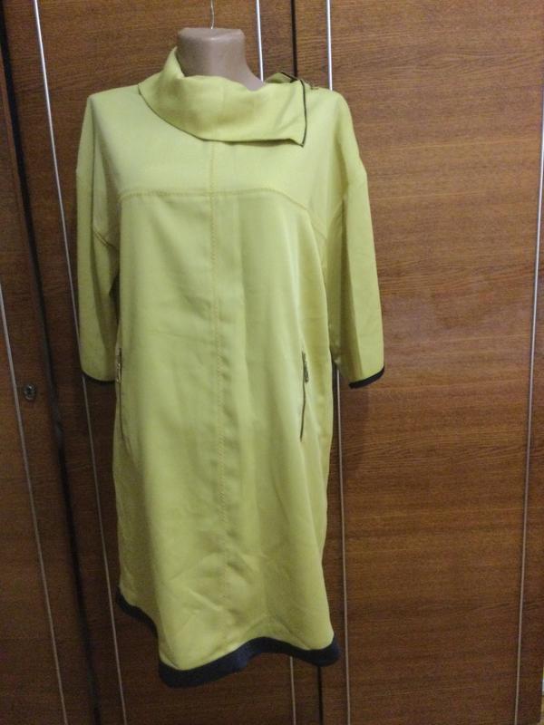 Плаття 48-50 р. Важкий атлас. ПОГ до 54 см. Довжина 90 см. Рукав спущений і довжина від шиі 54 см. Оригінально вирізаний рукав. З вітрини. Тому є нюанс (останнєфото). Тому і така ціна. Але, якщо комір носити відкритим , то непомітно. Сукня була на манекені на вітрині, тому під ворогом тканина лишилася темнішою. На останньому фото видно. Дорогі замочки вставлені в кишені і у комір.