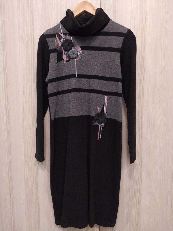 Платье ZAPS коллекция Польша размер XL из плотной черной ткани, перед с серыми вставками, украшен накладными цветами, маечками, бисером..., отложной ворот гольф. Ткань приятная на ощупь, очень мягкая. Удачно подобранные цвета отделки спереди. (без бумажной бирки). Состав 82% вискоза, 12% полиамид, 6% эластан. Замеры в свободном состоянии ткани плюс тянется легко, без перетягивания: ПОГ 45 см плюс 4 см, ПОталия 40 см плюс 4 см, ПОБ 44 см плюс 4 см, пройма 1/2 23 см, длина рукава от плеча 61 см, плечи 40 см, длина от горловины до низа 96 см. Платье выполнено из качественной ткани, выглядит стильно и дорого. Платье теплое. фото 6-10- предложения продавца