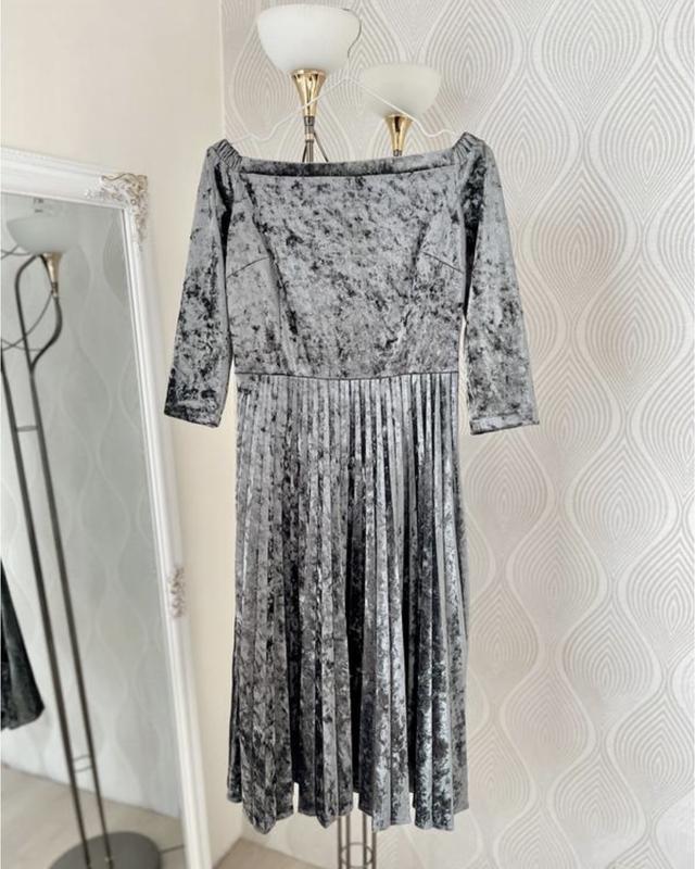 Бархатное платье с посадкой на плечах длины миди в оливковом цвете от бренда Reserved в размере S- M (38) Стан - идеальный, новый