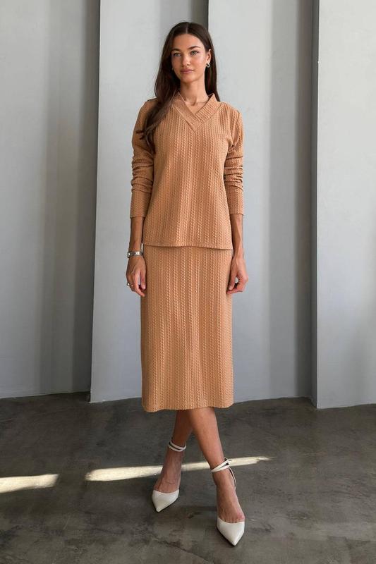 Фактурний трикотаж. Віскоза35%, поліестер 40%, еластан 5%. Зріст моделі 174 см Довжина кофти 61 см Довжина рукава 61 см Довжина сукні 115 см Обхват по лінії грудей кофти 102 см Обхват по лінії грудей сукні 82 см Обхват по лінії талії сукні 76 см Обхват по лінії стегон сукні 90 см Всі параметри вказані на розмір S З кожним розміром об'єм збільшується на 4 см.