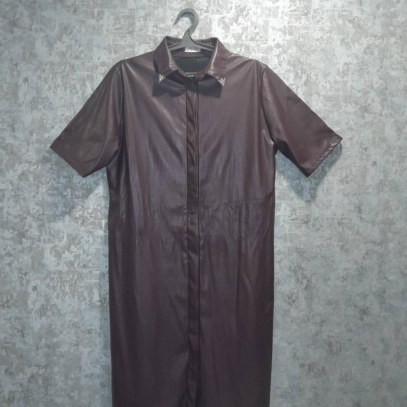 Кожезамовое платье цвета бордо с коротким рукавом, застегивается на скрытые пуговицы, строгий воротничок.