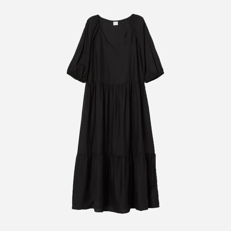 Платье длиной до икры из вискозной ткани. Треугольный вырез и короткие присборенные рукава с узкой резинкой снизу. Отрезная талия и низ со сборкой.