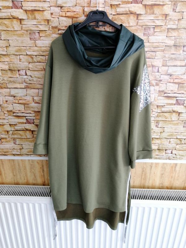 Сукня туніка батал з паєтками сукня туніка кольору хакі срібляста зірка і окантовка на роз...