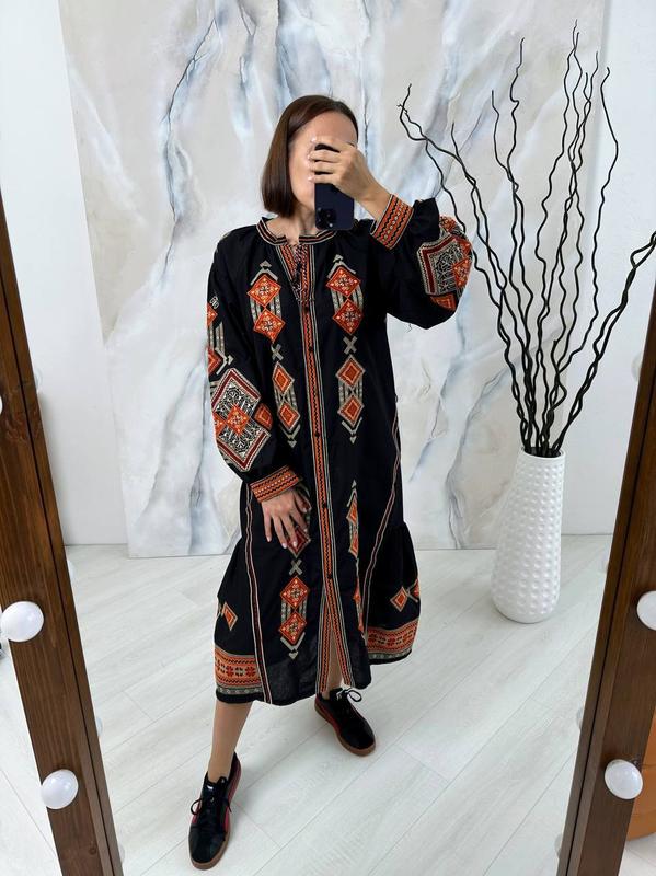 Колоритное платье миди с вышивкой, украинное платье вышиванка, этно платье с геометрическо...