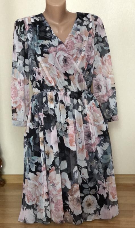 Платье шифоновое в цветочный принт, потайной замочек по спине.Стан идеален. Длина по спине-93сы Плечи-38см Рукав 3/4 от шва-48см Грудь-45см( еще тянется) Талия-39см(н/о)